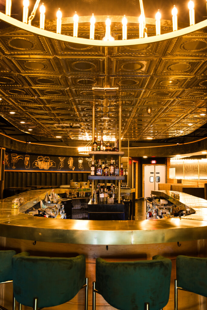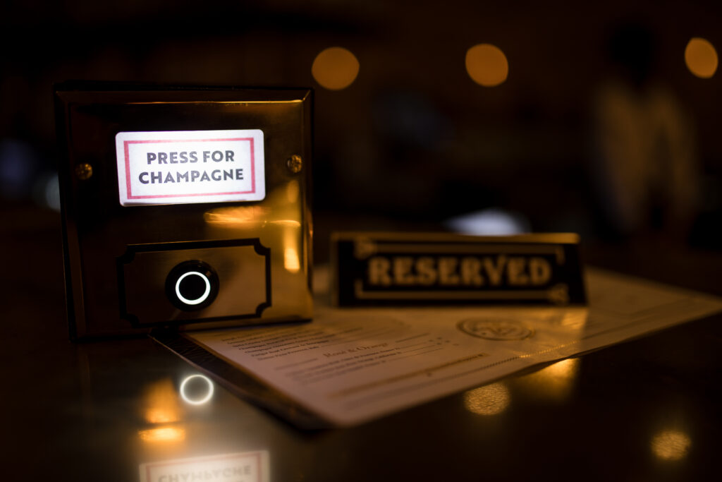 The interior has plush brown leather booths, timeless fixtures, and a central brass bar. World-renowned artist Michael Kalish contributes a bespoke 20-foot art piece to the ambiance of the interior that illustrates how to toast with different drinks. A unique and playful “Press for Champagne” button will signal the staff to bring over Champagne.