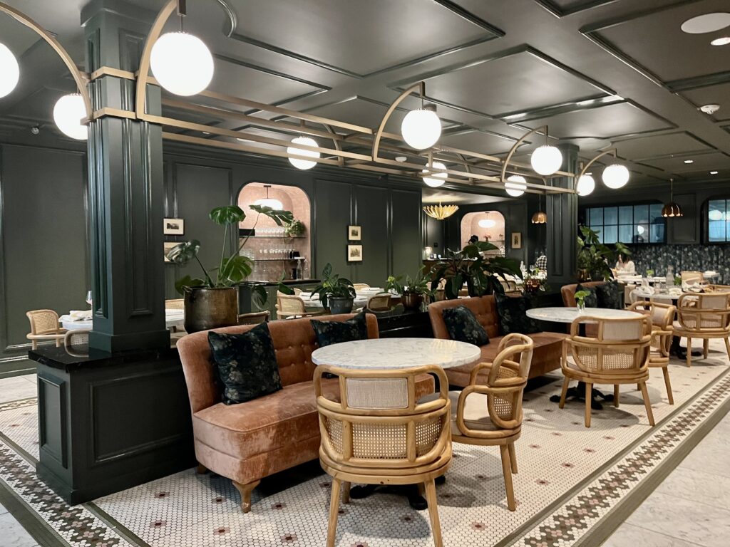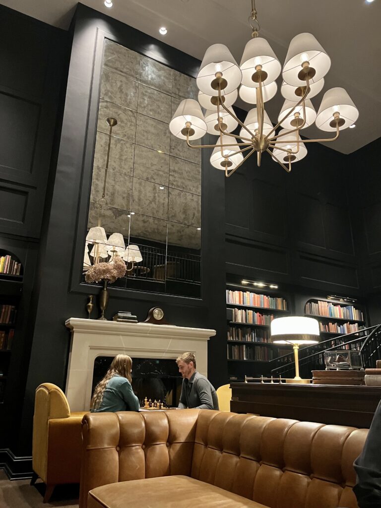 We appreciated the impressive architectural features from the moment we walked through the building’s Moorish-style arched entryway. Colorful beams along the ceiling were decorated with symbols of Freemasons and Shriners. The hotel’s Brasserie on the ground floor was bustling with diners and happy hour patrons sipping cocktails in the glow of natural light streaming in from large glass windows. A dreamy lounge area was outfitted with a gorgeous fireplace and bountiful bookshelves, elegant seating and cafe tables, where guests were engaging in lively conversations.
