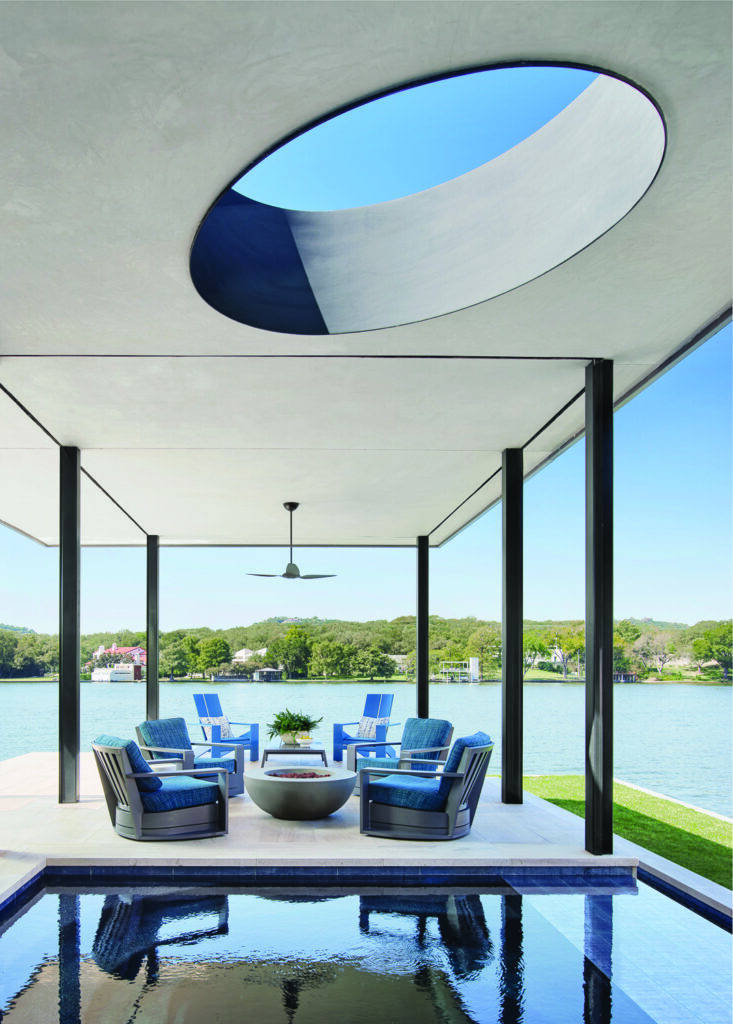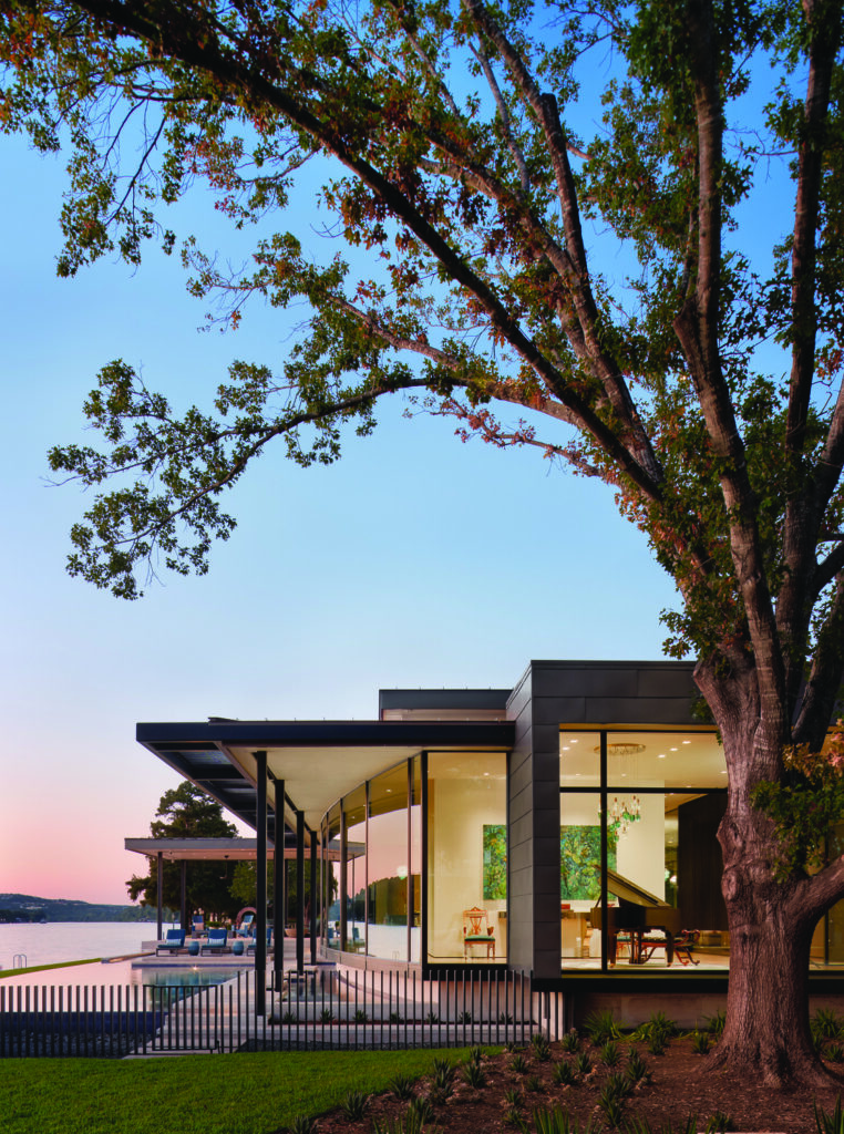 The location and topography of the Red Oak Residence played a pivotal role in shaping its design plan. Large swaths of glass were strategically used by local lighting experts LWSN to optimize breathtaking views, and curvilinear glass walls throughout the house provide soft, endless views and connectivity to the outdoors. The structure’s butterfly roof mimics the water movement that encircles the property.