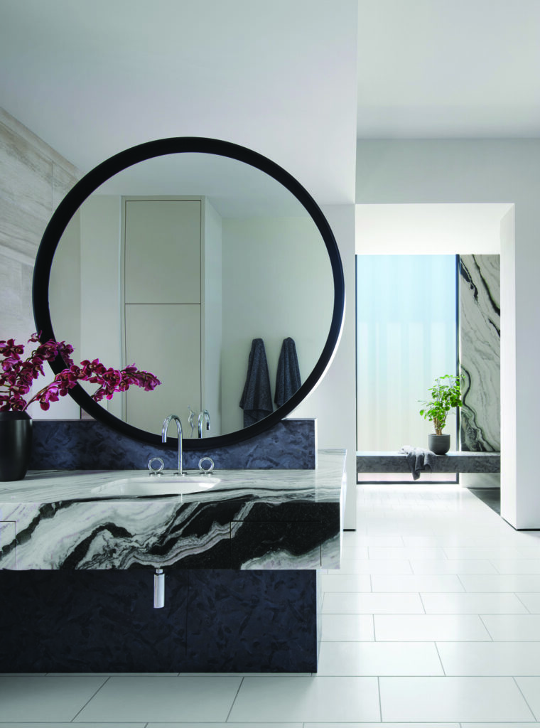 The complexity of the building process required early decision-making regarding interior design elements. One challenge was incorporating the client’s love for curved forms and a jewel-toned color palette. Stone slabs, key finishes and materials were selected at the project’s onset and held for almost five years, providing a foundation for the water motif expressed throughout the home.