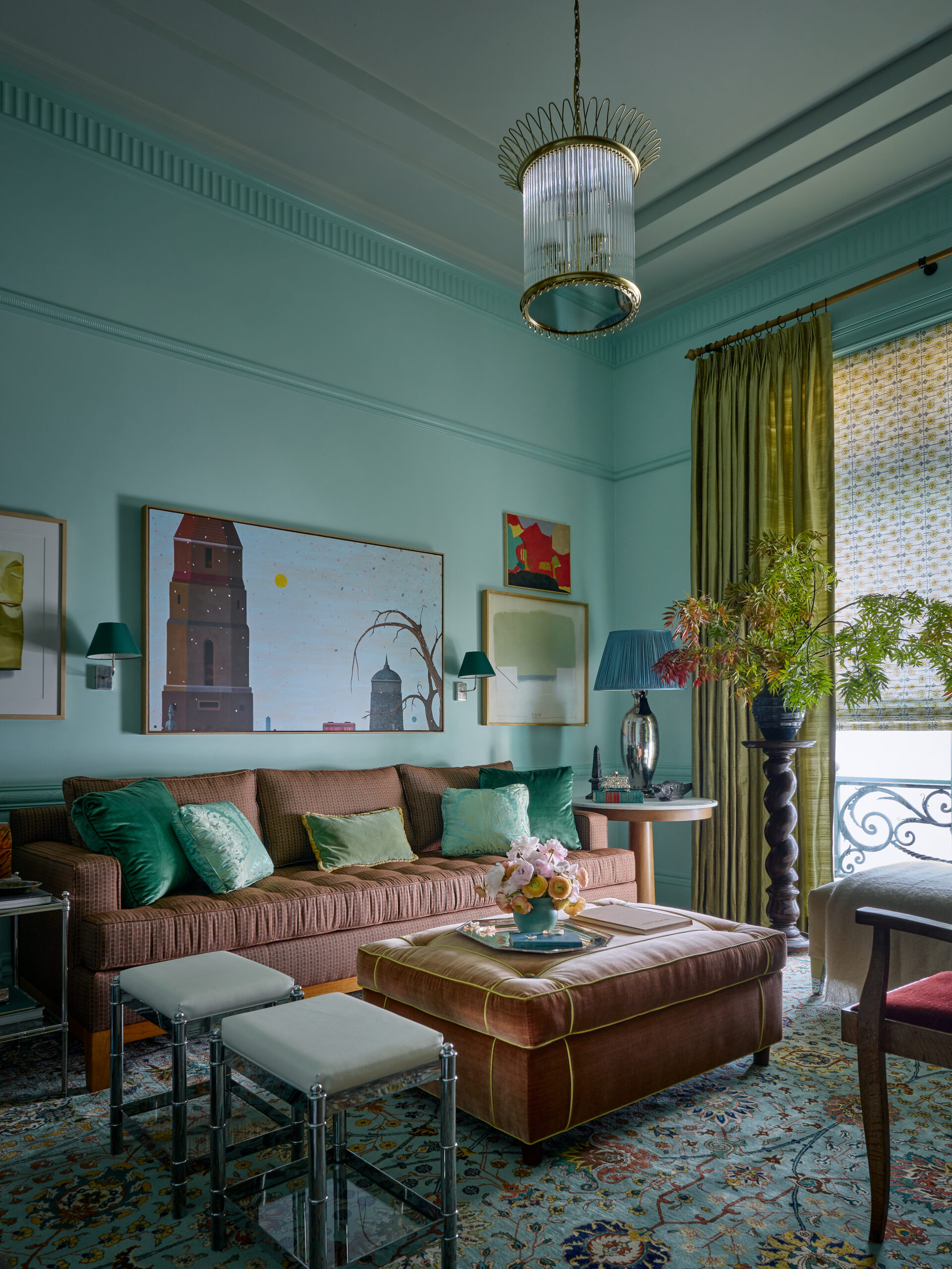 For Austin designer Avery Cox, the inspiration behind the Blue in Green listening room was personal. She drew from the “wonderful robin’s egg blue entryway, a color signaling comfort, joy, and creative freedom,” of her childhood home, a backdrop for what she describes as countless formative memories. Named for the iconic Miles Davis track, the room channels the improvisational nature of jazz, a reinterpretation of the “American chic, seen through a modern lens.”