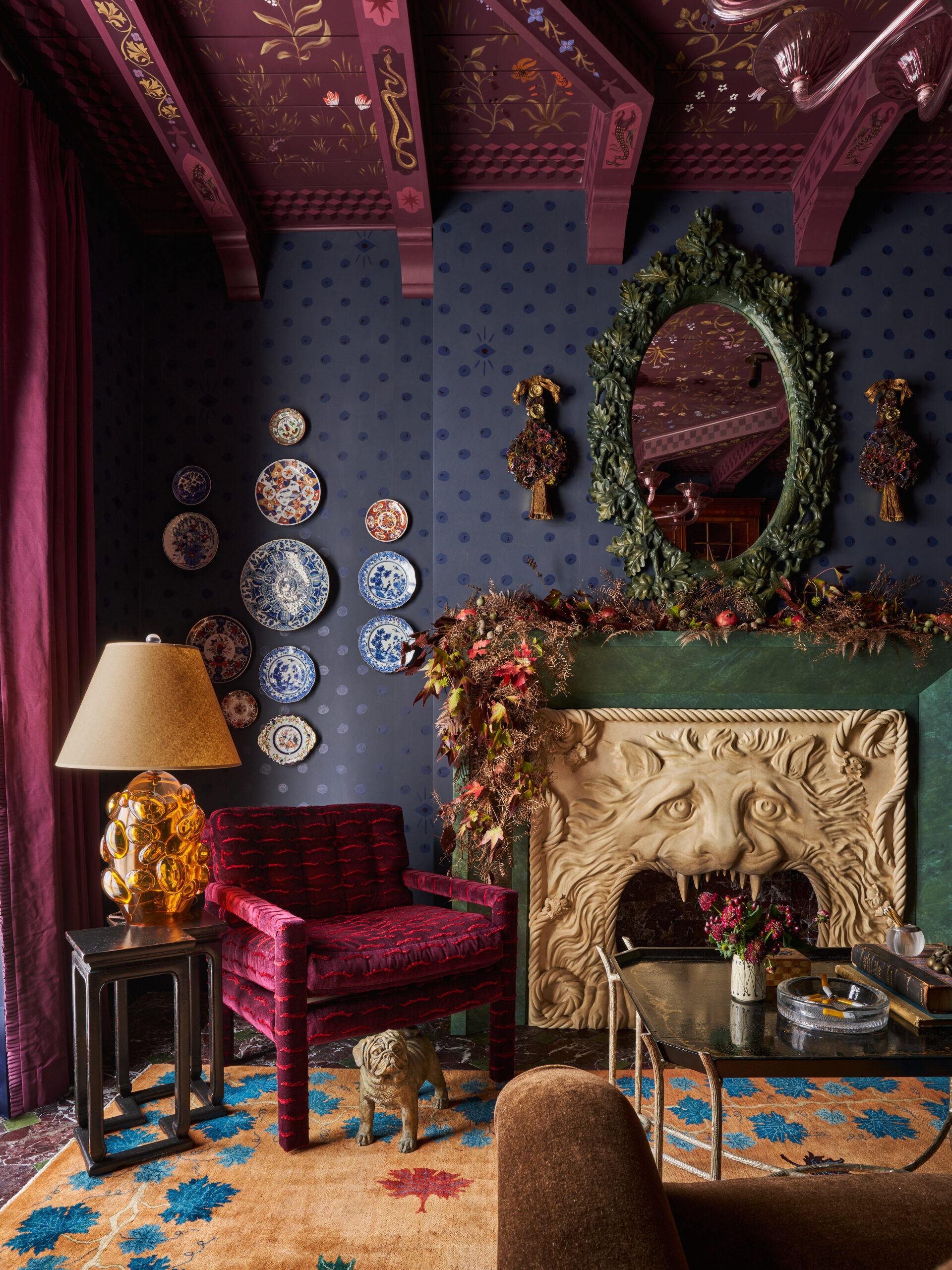 The final Austin contribution comes from Sarah Stacey, whose distinctive eye leans into spellbinding motifs, surrealism, and history inspired by “curiosities and what that might look like as a design style,” she says. The room channels everything from Medieval Bavaria to Schiaparelli runways and antique-rich havens with silver, leather books, and hand-painted beams. At its center is a 3D-printed fireplace surround with a Hell’s Mouth motif, custom-designed by Stacey, imparting theatrical impact.