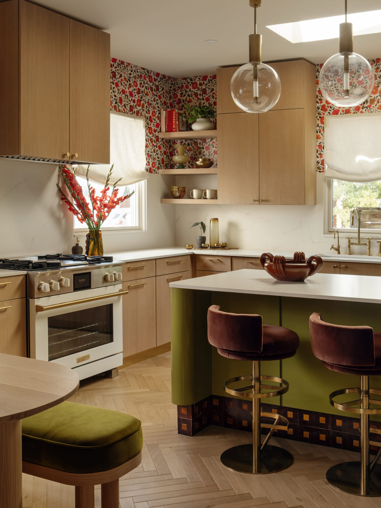Hey Now Interiors, led by founder and lead designer Amy Hadley, is an award-winning studio known for creating spaces that support both how clients feel and how they function day to day. For the Interiors Tour, the team partnered with Krager General Construction to renew a 1952 Allandale ranch home, preserving its old-Austin charm while introducing intentional modern updates for a young family. The front living room became a Wes Anderson–inspired lounge featuring Western accents, Katie Kime Austin toile wallpaper and a lemon-yellow Malm fireplace. A striking amber glass rondel door, double-sided built-in and new 7.5-foot arches elevate flow and architectural character. In the kitchen, the family’s playful “bougie Waffle House” vision comes to life with a cooktop island, recessed ceiling vent and an antique barrister cabinet converted into upper storage. The result is a warm, colorful home that feels both distinctly modern and rooted in its midcentury spirit.