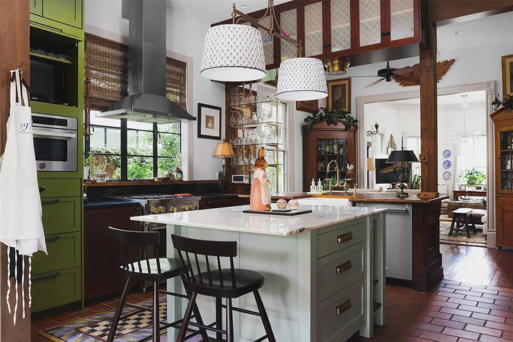 This 1890 Victorian cottage could just as easily belong on New Orleans’ St. Charles Avenue. Behind an antique French archway, the home is shaded by a large live oak tree. Inside, period features include a 1897 Shaw’s sink, a Victorian Eastlake general store counter, and original oak panels salvaged from a Chicago bank. Dormer windows and angled ceilings add cozy charm to the converted attic, while the garden-like backyard and patio evoke a French Quarter courtyard.