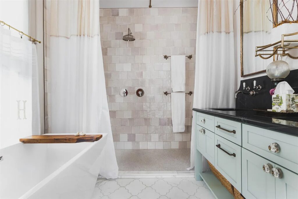 Inside this beautiful old blue home, the interiors have been renovated to match modern tastes without sacrificing its classic turn-of-the-century character. The living room offers a generous amount of space, while the walls remain up to keep it separate from the equally roomy kitchen, complete with a long island with a dining extension. The primary suite comes equipped with a sliding glass door that leads out to the backyard, just steps from the pool, for a different kind of en suite bath experience. The detached studio adds additional space to the property, perfect for anyone needing a home office or a spot to get away without leaving home.