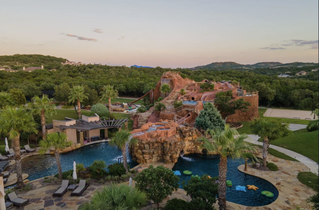 Wake up and walk out to views of the rolling hills of Boerne, Texas, then fly down one of the various park-quality water slides into your massive pool in the former home of San Antonio Spurs legend Tony Parker.