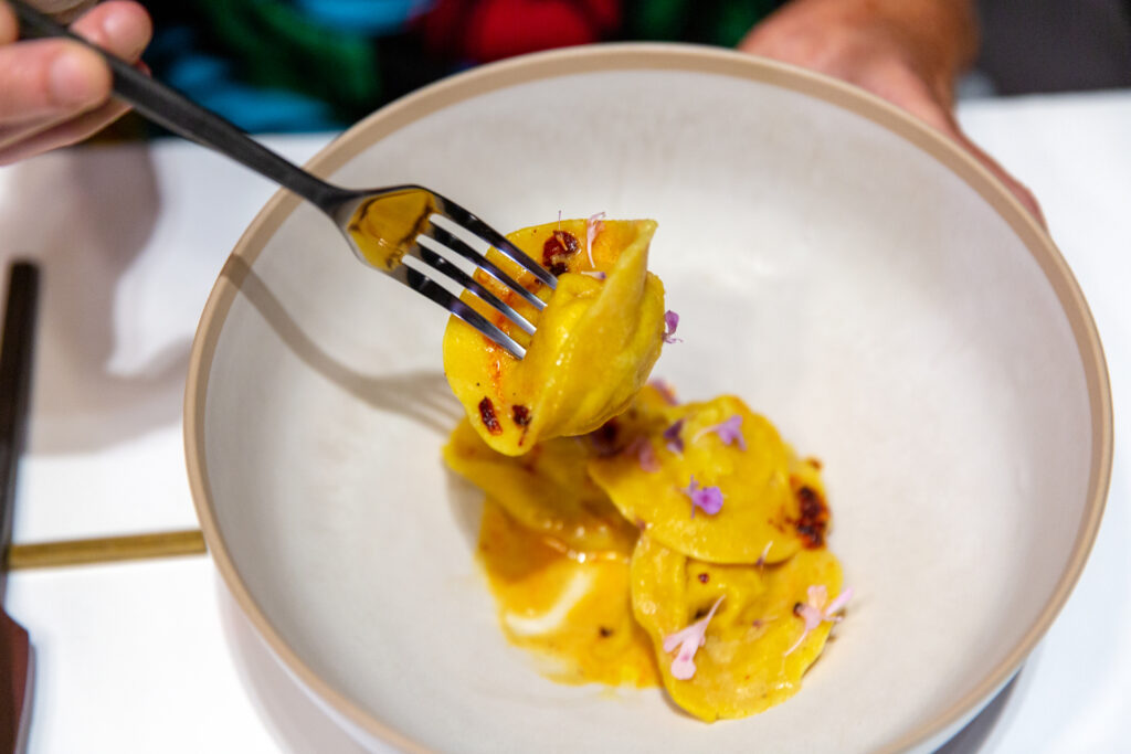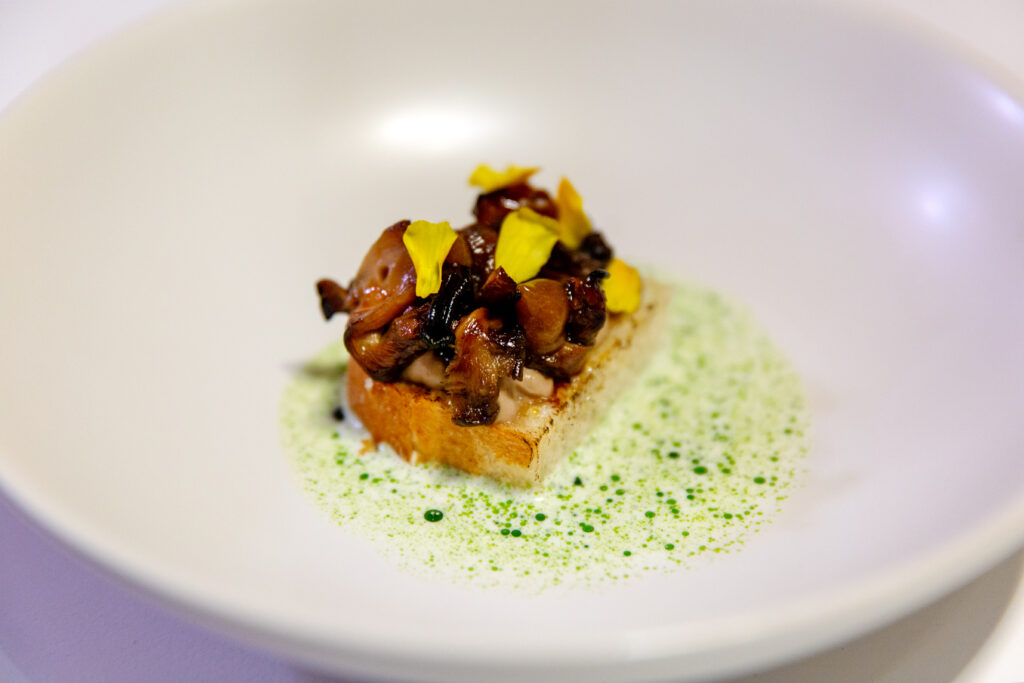 We were treated to artfully created, summery tastes featuring Chef Wheeler’s scratch-made pastas, tofu, vegan butters, cheeses and breads. The small bites started with a rich confit potato with smoked crème fraîche and wakame caviar as well as a beet tartelette with beetroot cream and almond cheese. The pillowy house made focaccia was paired with a most delicious romanesco along with shitake butter. Our favorite standout on the menu was a plate featuring yakatori oyster mushrooms on a sweet brioche toast. We also loved the comforting pasta course that included hand-shaped parsnip cappelletti with miso butter, caramelized yeast and Szechwan. Dessert bites were just as decadent, including a sour cherry cheesecake with poached cherries and tonka bean panna cotta, followed by a coffee maple ice cream to conclude the meal.